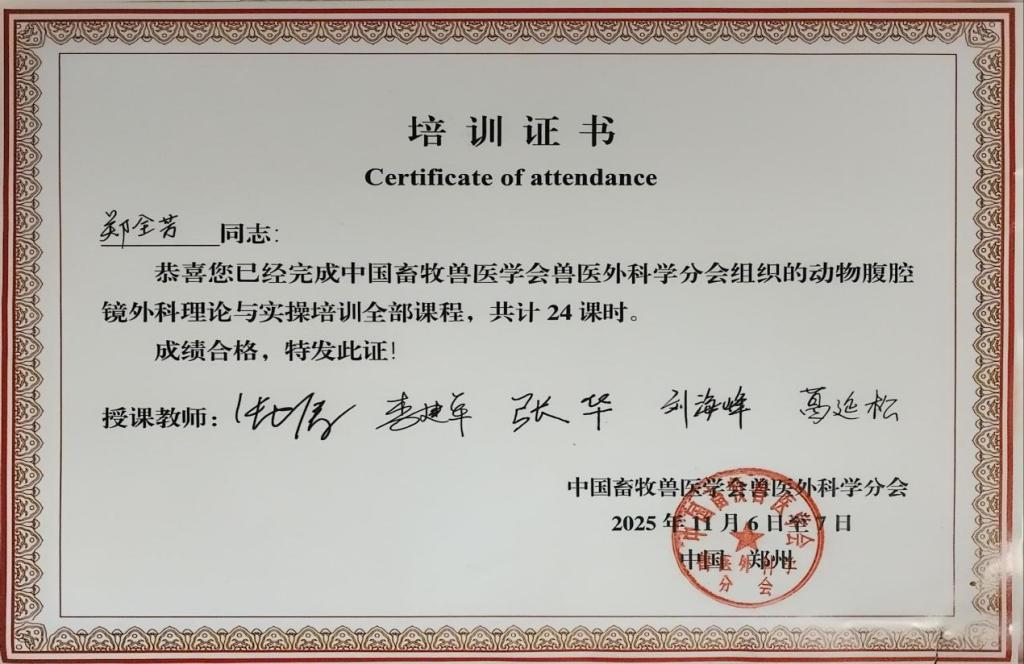 2025年11月7日至9日,中国畜牧兽医学会兽医外科分会第二十七次学术研讨会暨第十一届二次常务理事会在河南农业大学举行,我院兽医外科课程组郑全芳、饶丹、麻冰洁、冀锦朝四位教师参会。
