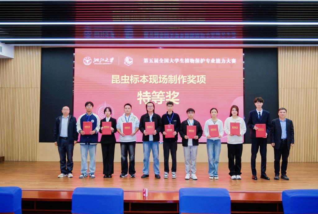 2025年11月7日-9日,第五届全国大学生植物保护专业能力大赛在浙江大学紫金港校区举办。我院植物保护教研室王春生和贾志飞两位老师带队,组织8位植物保护专业的学生参赛。经多轮激烈角逐,参赛学生奋力拼搏,最终斩获特等奖1项、二等奖2项、三等奖6项,我校代表队同步获评团体三等奖。