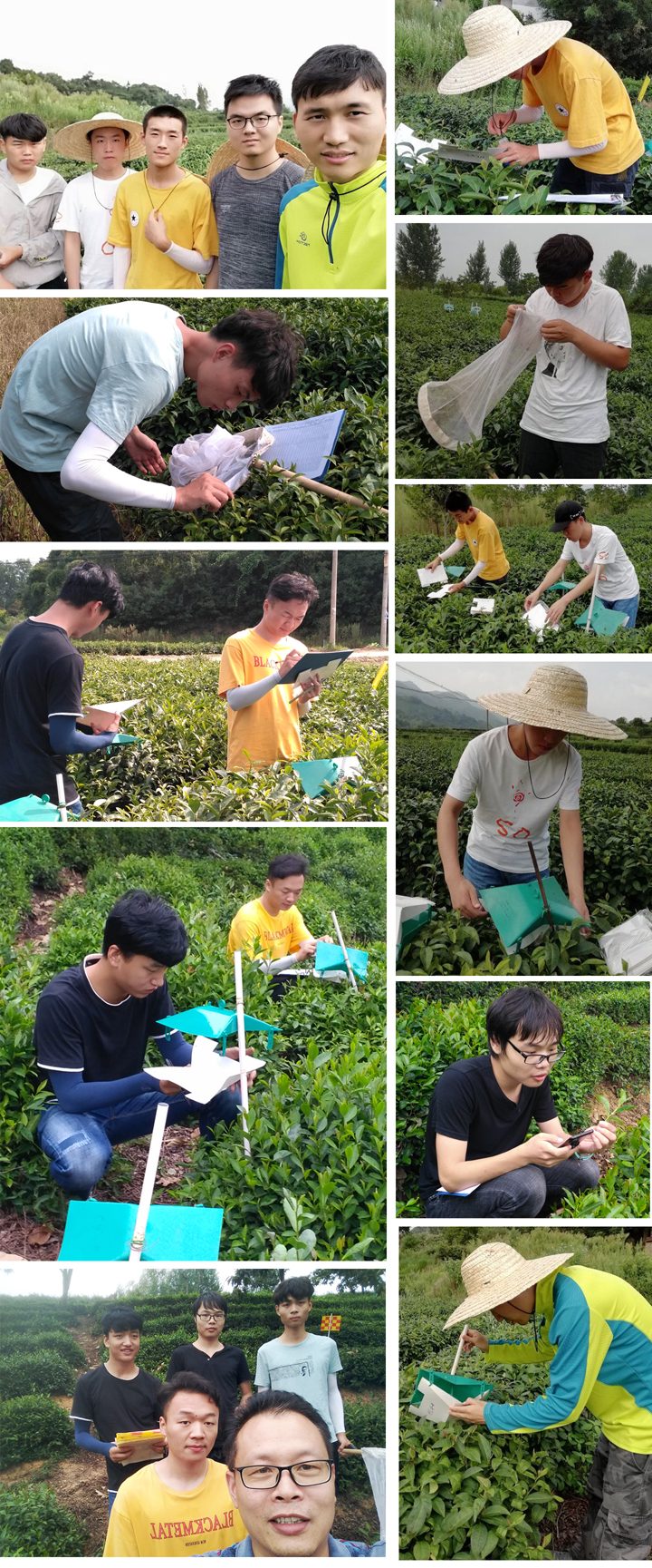 2019年8月11日,立秋后的清晨让人倍感清爽。我院植物保护教研室潘鹏亮和耿书宝博士带领的科研小组准时集合,开始了茶园害虫发生规律例行调查。