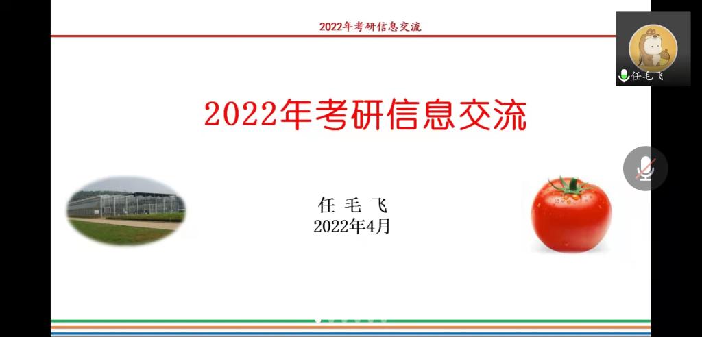 4月3日晚上8:00,园艺学院举办2022届毕业生考研复试技巧及调剂注意事项线上辅导专题会。院长龚守富、党总支副书记陈丽文、全体考研过国家线准毕业生参会,会议特邀湖南农业大学在读博士任毛飞做复试技巧及调剂注意事项讲座及在线答疑。龚守富主持会议。